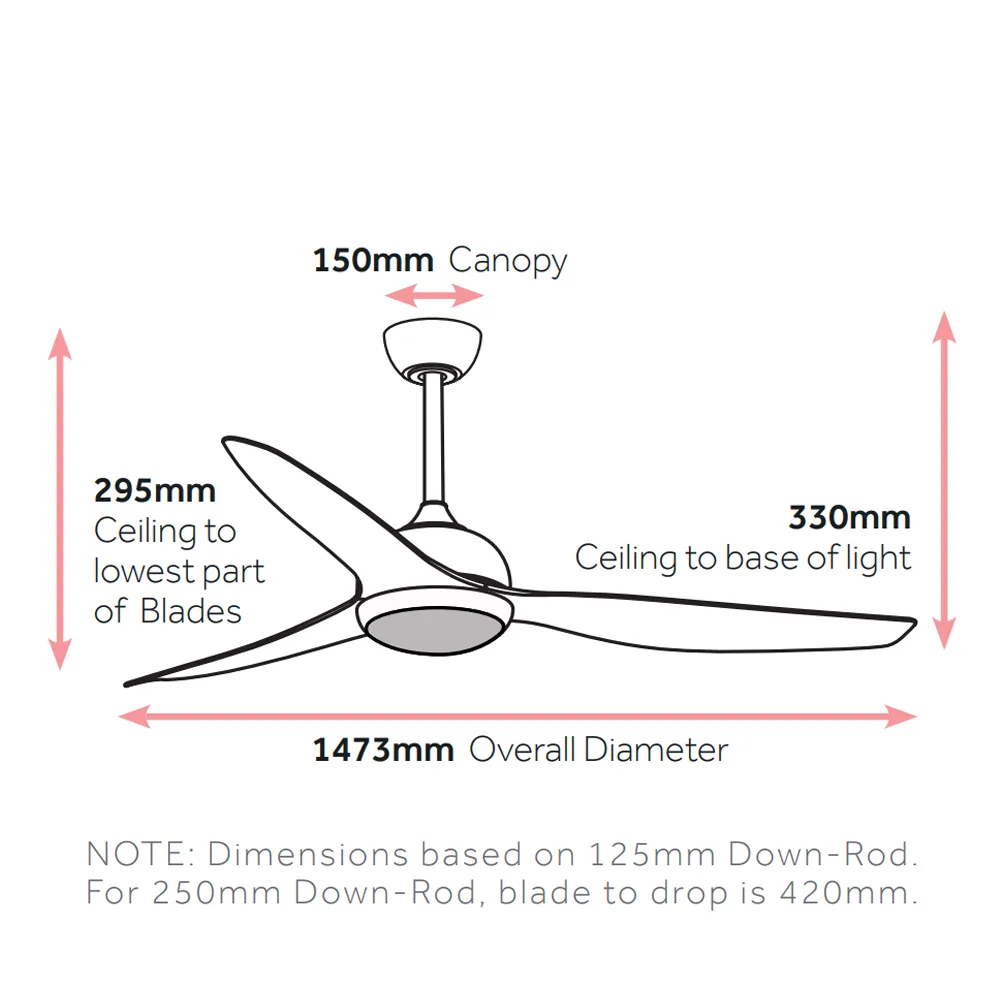 | Ceiling to Lowest Point of Blade | 295mm (330mm to base of light) |