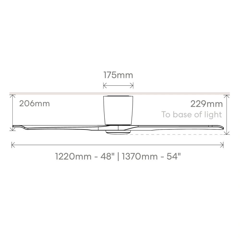 | Ceiling to Lowest Point of Blade | 206mm (229mm to base of light) |