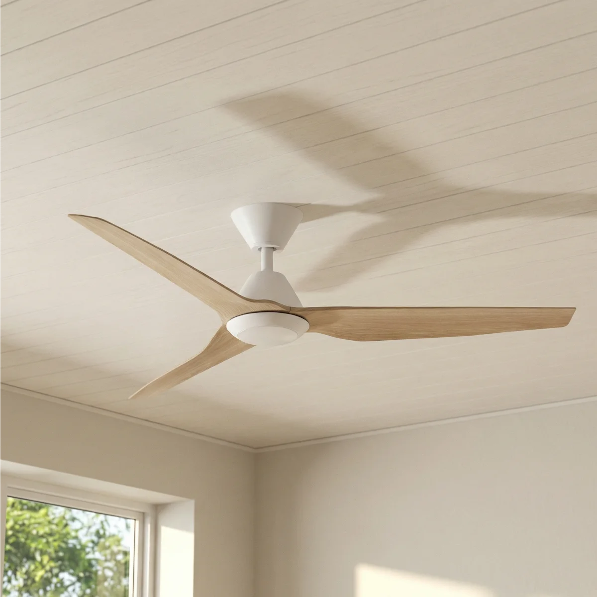 This architectural ceiling fan features a refined Scandinavian aesthetic, pairing a matte white housing with beechwood-finish ABS blades. Designed for sleep, it utilises a high-efficiency DC motor to ensure ultra-quiet performance, making it the ideal specification for any bedroom. The minimalist profile includes an integrated 20W CCT LED light, allowing designers to adjust the colour temperature to suit the interior palette. Supplied with a 6-speed remote control, this fixture offers a quiet and energy-efficient climate solution that maintains the visual integrity of contemporary spaces.