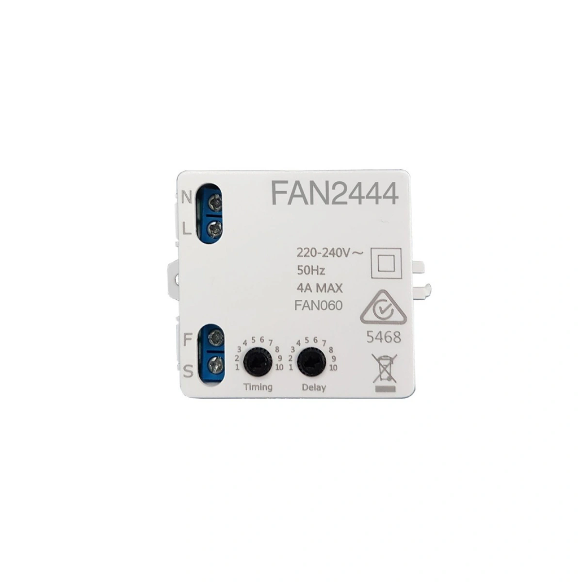 Adjustable run-on timer from 0–20 minutes with a 0–5 minute delay start. Designed to fit wall-mounted flush boxes or fan light assemblies.